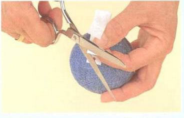 2. Вденьте в иглу металлизированную нитку для вышивания и завяжите на конце двойной узел. Введите иглу в шар на расстоянии примерно 3 см от верхней булавки и выведите наружу у булавки. Потяните за нитку, чтобы узел оказался под обмоткой.