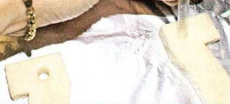 18) Теперь слепите мешочек и аккуратно нанесите на него рельеф «мешковины» с помощью ножа. Верх мешка сделайте из полоски теста, укладывая ее складками к месту перевязки. Также слепите саму повязочку и нашивку, где позже будет нарисована надпись «сiль».