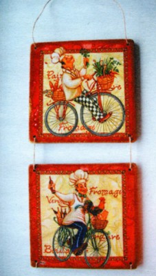 Вам потребуется: фанерная основа размером 15 х 15 см со скошенными краями – 2 шт., грунтовка по дереву, акриловые краски, клей ПВА (разбавить с водой 1:1), салфетка с поварятами, губки, акриловый лак, крючки-вешалки.