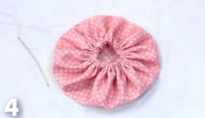 4) Подгибаем края кругов вовнутрь и наметываем по кругу с помощью иголки и нитки в тон ткани. Затягиваем нить, закрепляем и получаем круглую заготовку.