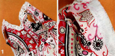 2) Обработайте зигзагообразной строчкой вертикальные срезы на спинке платья. Пристрочите узкую полоску фиксирующей ленты – застежку. Подогните два раза нижний край юбки и отстрочите его по краю. Декорируйте юбку узкой кружевной тесьмой. По выкройке лифа платья из любой другой ткани также можно сшить блузку для куклы (см. фото на стр. 29).