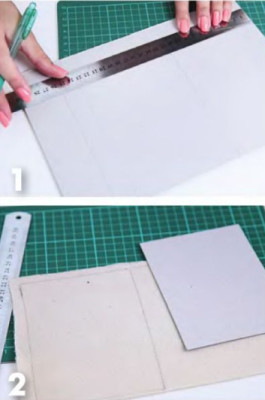 1) Расчерчиваем картон под обложку, не забывая про припуск в 2-3 мм. Передняя и задняя стороны обложки должны быть равными 10,8×15 см. Корешок – 2,1 см. Разрезаем картон.